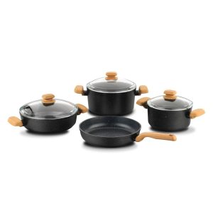 سرویس قابلمه گرانیتی کرکماز مدل MONTANA A1249 محصول جدید برند زیبا و معتبر KORKMAZ کشور ترکیه است. سرویسی زیبا و متفاوت که همراه آشپزی شما در مهمانی ها و دورهمی ها خواهد بود. این سرویس 7 پارچه شامل 3 قابلمه همراه با درب و یک ماهیتابه دسته دار بدون درب است. سایز قابلمه ها 10.5*20، 12.5*24 و 7*26 سانتی متر است که دارای حجم های 3، 5 و 3.5 لیتر و تابه آن نیز دارای سایز 5*26 سانتی متر با حجم 2.5 لیتر است. این سرویس دارای رنگ مشکی با دسته های طرح چوب می باشد.