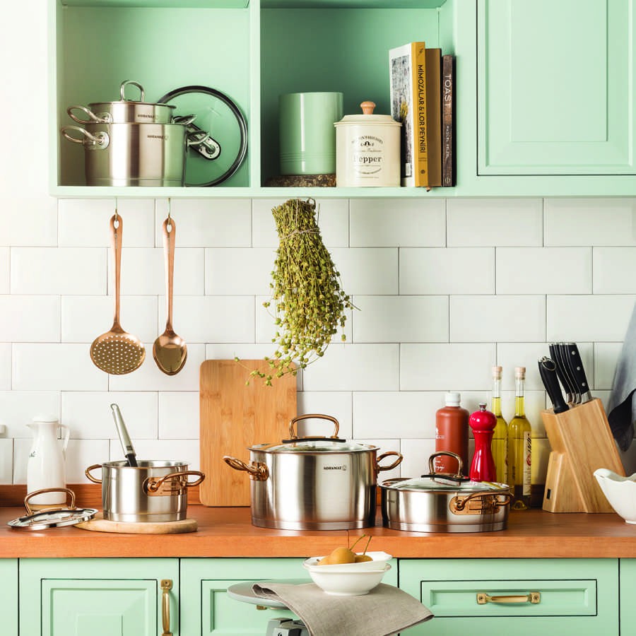 استیل کرکماز مدل پرولاین A1149 یکی از دیگر سرویسهای پخت و پز زیبا و با کیفیت شرکت کرکماز ترکیه میباشد. دستگیرههای این سرویس از استیل ضد زنگ و به رنگ زرگلد (متمایل به رنگ مسی) ساخته شده است. برای ساخت قابلمهها از استیل ضد زنگ 18/10 (Cr-Ni 18/10 stainless steel) استفاده گردیده که این استیل حاوی 18 درصد کروم و 10 درصد نیکل میباشد. وجود کروم و نیکل در این استیل باعث مقاومت و ظاهر براق قابلمهها خواهد شد. سرویس قابلمه 8 پارچه کرکماز مدل Proline A1149 از 3 قابلمه درب دار با ظرفیتهای 2، 4 و 6.3 لیتر تشکیل شده است که ابعاد آنها به ترتیب 20×12.5 ،16×10 و 24×14 سانتیمتر میباشد. در این سرویس یک عدد تابه درب دار با گنجایش 3.1 لیتر و ابعاد 24×7 سانتیمتری نیز وجود دارد. طراحی دربها به گونهای است که به خوبی بر روی قابلمهها قرار میگیرد و بخار داخل آن را حبس خواهد کرد و همچنین بدنه عایق مانند این سرویس باعث حفظ دمای مناسب برای مدت طولانی خواهد شد.