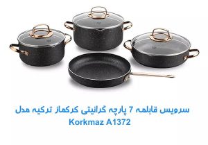 کرکماز است. این ست هفت پارچه شامل سه عدد قابلمه درب دار و یک تابه دسته دار بدون درب است. رنگ این ست قابلمه مشکی است که بسیار جذاب و منحصر به فرد است. شما به کمک این سرویس مرغوب بدون نگرانی می توانید آشپزی کنید؛ چرا که این ست قابلمه نچسب بوده و شما می توانید با خیال آسوده مواد غذایتان را در آن بپزید. این سرویس قابلمه korkmaz A1372 با پوشش داخلی گرانیتی سطحی صاف دارد و مقاومت بالایی در برابر خراشیدگی دارد. همچنین پوشش خارجی قابلمه از سیلیکون است که در برابر ضربه و حرارت از استحکام کافی برخوردار است. در ضمن درب این قابلمه ها شیشه ای است و دسته های این محصول مسی رنگ است که زیبایی خاصی به این سرویس بخشیده است. بر روی لبه های درب صافی تعبیه شده است که به کمک آن می توانید به راحتی آب داخل قابلمه را خارج کنید .